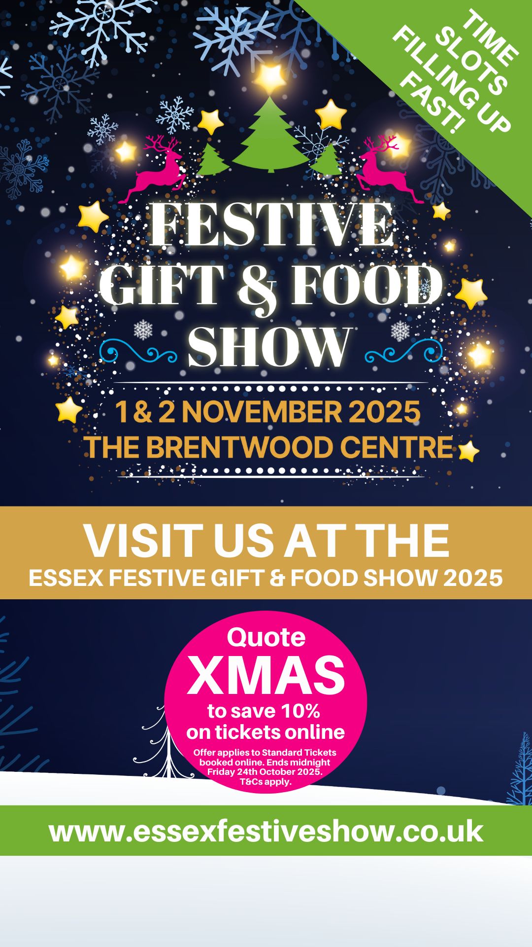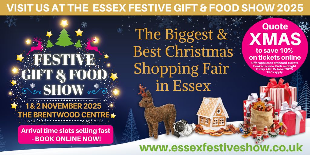 Come and see us at the Essex Festive Gift & Food Show on Saturday 1st and Sunday 2nd November 2025. Tickets are limited but we have a discount code that will save you 10% on entry when you book Standard Tickets online. Just quote XMAS when you book. The offer ends at midnight on Friday 24th October 2025. To book visit www.essexfestiveshow.co.uk.